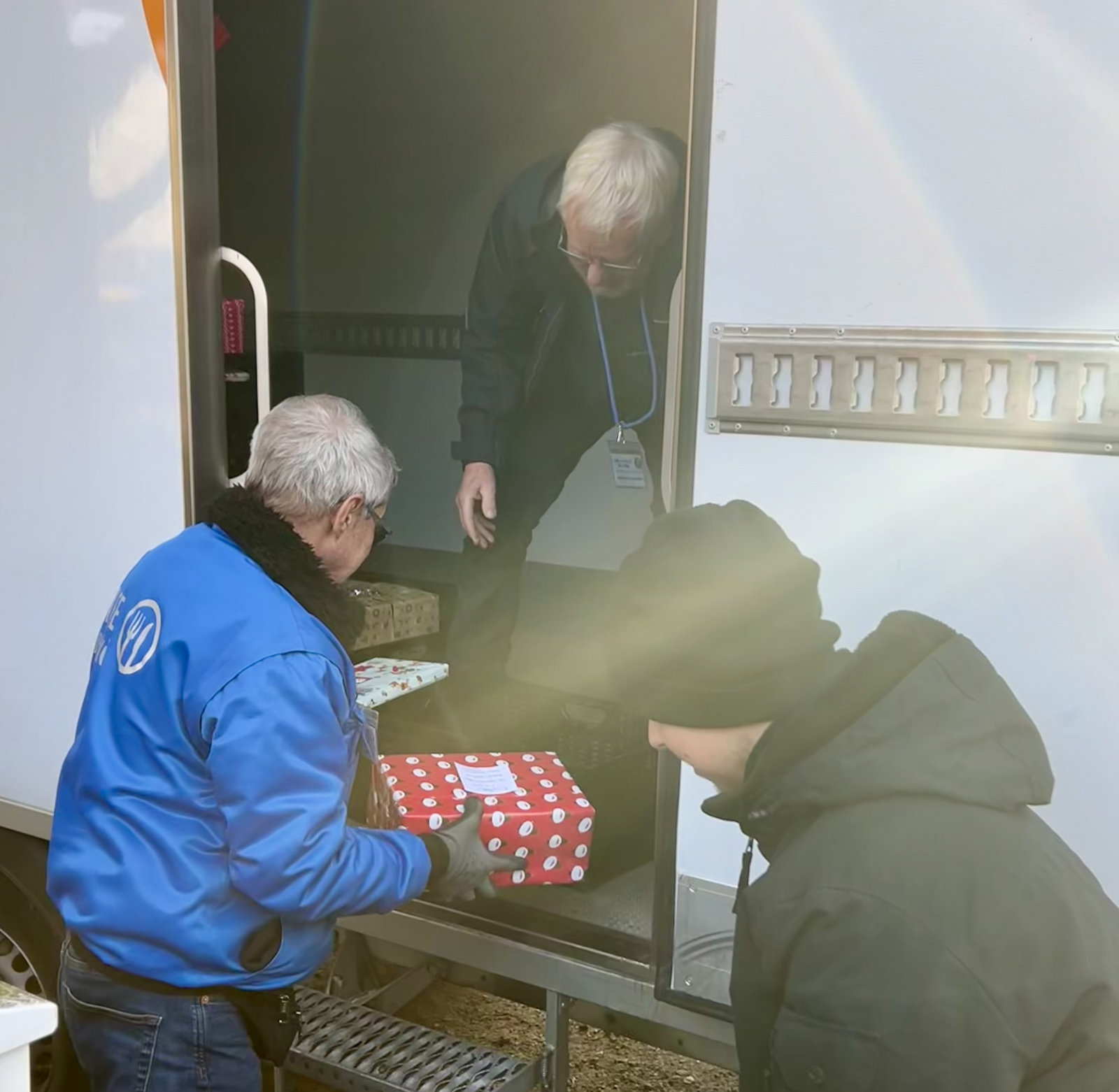 Die Ehrenamtlichen Stefan Dohrmann und Wolfgang Engelbrecht packen die Geschenke gleich in den Tafel Sprinter, um sie in die Ausgabestellen zu den Kindern unserer Kunden zu bringen.